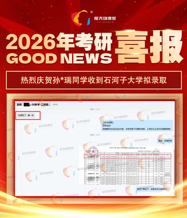 复试前,屋大维课堂也为孙同学提供了丰富的复试经验,从政治笔试到综合能力面试,再到英语能力测评,帮他梳理了管理类联考专业的高频面试问题,这也对于他的复试起到了很大的作用,最终以第一名的成绩获得了石河子大学的拟录取。